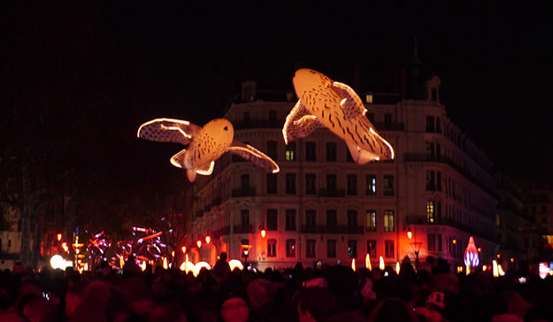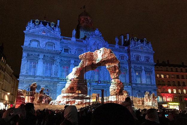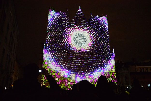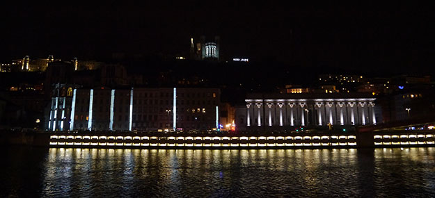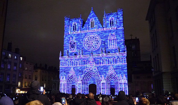 スケールの大きな光の作品として、毎年ソーヌ川に面した教会や大聖堂、裁判所などの巨大な建築、そしてフルヴィエールの丘全体を使った照明パフォーマンスがある。幾つもの建築と、丘の様々な場所に設置されたムービングライトなどが音楽と共に全てが連動して演出され、この規模での整った光の動きをみられるというのはなかなかできない体験である。