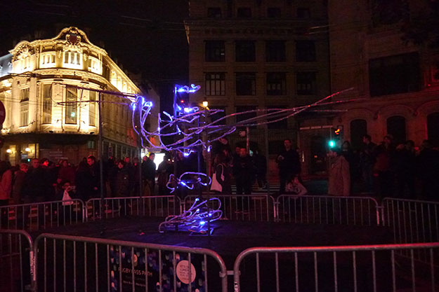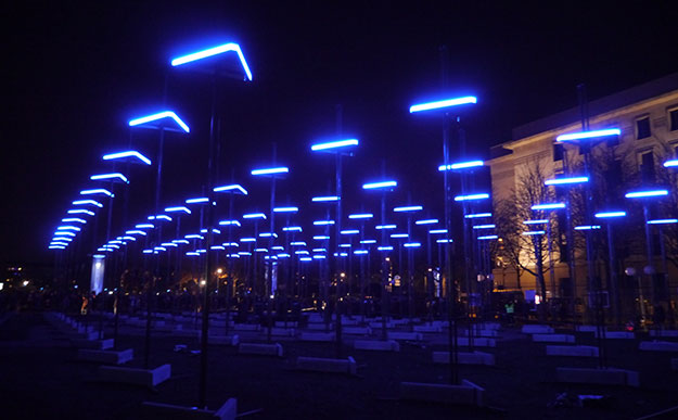 旧市街の狭い広場に長さ1mほどの無数のLEDバーが垂直に置かれ、人の手の動きと連動して、音と光を奏でる作品。白い点や線が人の動きで気持ち良くコントロールされ、時折混じる赤い点の連なりが広い面として感じさせる演出で、シンプルなこの作品に奥行きを与えていた。