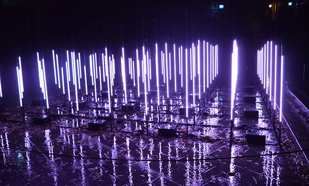 今回10名程度のメンバーと訪問したのだが、そこで好評だったのがこちらの作品。人の動きをモーションキャプチャーで捉え、それをチューブライトの中のLEDが再現している。昨年はサッカーのシュートをキーパーがキャッチするものだったが、今年はラクビーのパスが使われていた。光の点が人の動きを室間に出現させ、目が慣れるとその動きにしか見えなくなってきて面白い。