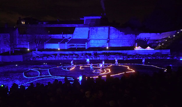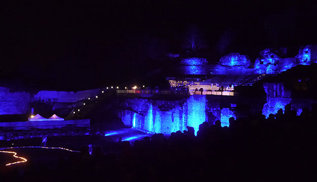 蝋燭を使ったこちらの演出は、光の祭典の原点の流れを汲んだ企画。古代劇場内で顔や祭典のロゴをかたどったものと、扇型の階段に無数の蝋燭がレイアウトされている。蝋燭の火の光に、ゆっくりと色が移り変わる照明も加えられ、とても豊かな色彩を放っていた。