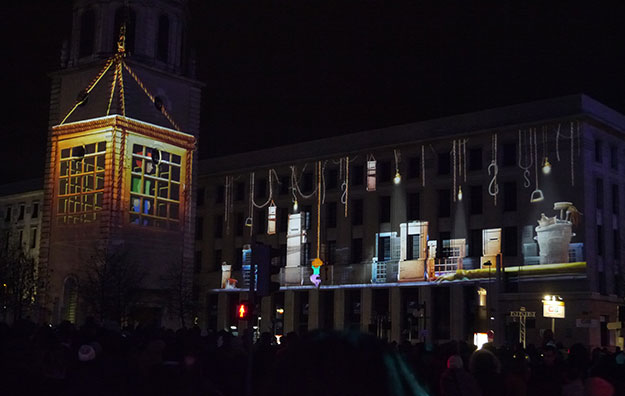 そんなバックボーンがある光の祭典だが、日本のようなLEDを大量に使ういわゆる「イルミネーション」ではなく、ユニークでアート性もある多様な光のインスタレーション、そしてプロジェクションマッピングをはじめとした映像などの演出が、中心市街地のさまざまな所で約50余り設置されている。