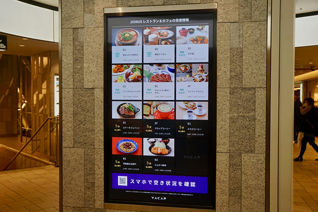 今回紹介する空席情報サイネージは、こうした店頭型のデジタルサイネージによる来店動機とは異なる側面からの来店誘導に貢献することが期待できそうだ。半年間ほどのテスト運用を経てサービスを開始したこのサービス「VACAN」は、横浜駅前の相鉄ジョイナスと高島屋で2月1日からスタートした。