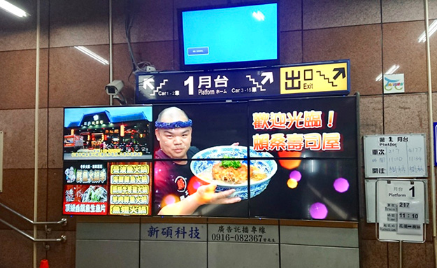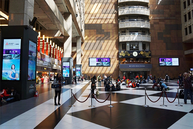 台北から花蓮までの車窓は、日本のそれと非常に似ている。いい意味で外国にいる感じがほとんどしない、どこか懐かしい景色が続く。花蓮駅に到着すると、早速デジタルサイネージが出迎えてくれた。ホームとホームをつなぐ地下通路の壁面に6面マルチが設置されていた。この場所は視認性が抜群であるが、お世辞にも画質がいいとは言えず(というかかなり悪く、時々フリーズするのはご愛嬌)よくこれでやっているなあという印象だが、それでも複数の広告が放映されていた。