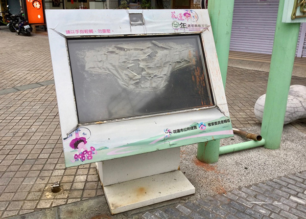 こうした事例の影で、花蓮でもデジタルサイネージの残骸を見てしまった。これは観光案内のタッチパネルのようで、よく見るとカメラが付いている。完全に屋外に設置され、いつからなのかそのまま放置されているのでこのような無残な姿を晒している。誤解なきように言っておくが、これは地震とは全く関係なくこの状態なのである。これほどの状態になるほど前から設置されていたもので、どうやら公的なもののようである。こうした「墓石サイネージ」は万国共通である。
