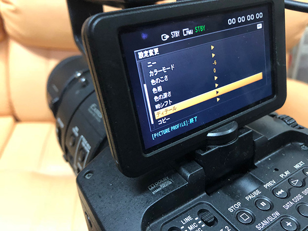 例えばシャープネス/ディテールと言うものもはっきり輪郭とかエッジと書いてもらった方が解りやすいし、極端だが、電源を入れた時のスタートアップ画面で「記録モード」か「シネマモード」を選べると言うのもいい。シネマモードを選ぶと自動的にシネマガンマで24p記録をするとか、そうすれば同じカメラでも違った表現ができると言うことが分かるだろうし、それが解れば勉強して触ってみようと言う気にもなるのではなかろうか?そんなことを話していたら自然にLog収録の話になった。