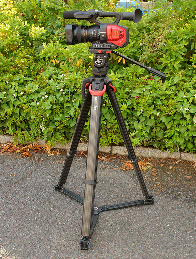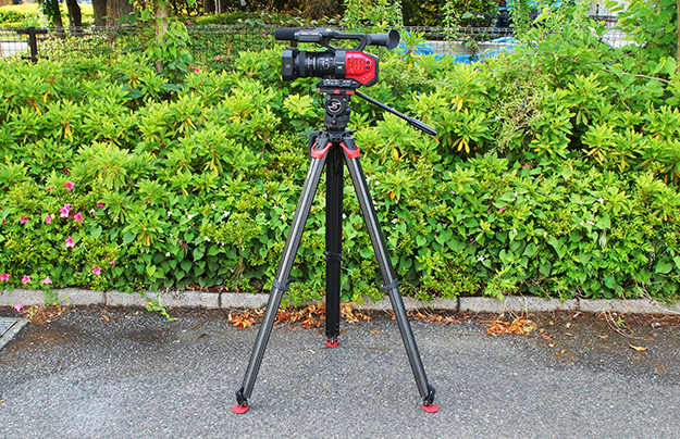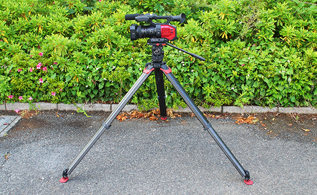 また、ミッドスプレッダーは付いているが、これを外してモノチューブと同じ様な使い方をすれば、脚の広がり具合を3段階(20°/46°/72°)に簡単に調整できるので、通常の高さから超ローモードのハイハット要らずの高さまでワンタッチで変更が出来る。逆にENG等で三脚を直ぐに移動するような開閉動作が多いときはミッドスプレッダーを付けた方が取り回しは良い。勿論それによる剛性感は更に増すのでリミット荷重時での振り回しでもしっかりと安定している。今回お借りしたセットには更にオプションとして専用のキャリーハンドルも用意されているので、ちょっとした移動時には中々重宝した事を付け加えよう。