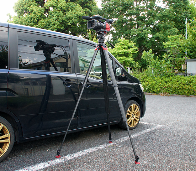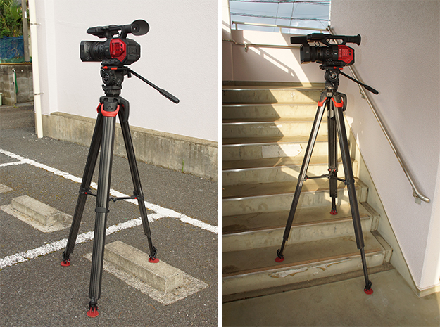 筆者が現場で使ってみたが、ツインチューブの脚と比べても全く剛性の不安感は無い。またモノチューブの利点は段差があるような場所でも確実にグランドレベルを築けると言う事だろう。ほんのちょっとの段差がツインチューブだと致命傷になるが、Flowtech 75はかなりの高低差でも全く問題がない。舞台撮影等で客席から撮るような場合、これは大きな武器になる(Flowtech 75はミッドスプレッダーが上段下部に付いているので付けたままでもある程度の段差はクリア出来る)。なお、Vinten Vision blueとSachtler Ace Lのフローテックシステムにはミッドスプレッダーは付属していないとのこと。