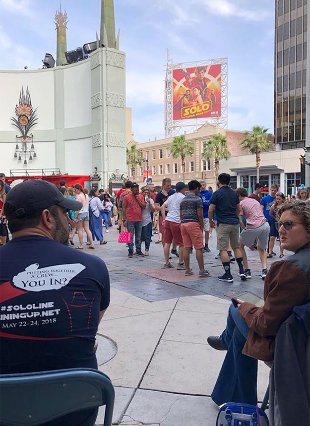 列が正式に始まる数日前の5月20日から、チャイニーズ・シアター敷地内で準備を進める主催者Liningupのメンバー達。ハリウッド・ブルバードの反対側には「ハン・ソロ」の巨大なビルボードがそびえる(主催者提供)Photo courtesy:LiningUp for Star Wars Hollywood @ Facebook