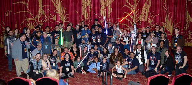 上映開始直前の模様。ライトセーバーをかざし、記念写真に納まる主催者達(主催者提供)Photo courtesy : LiningUp for Star Wars Hollywood @ Facebook