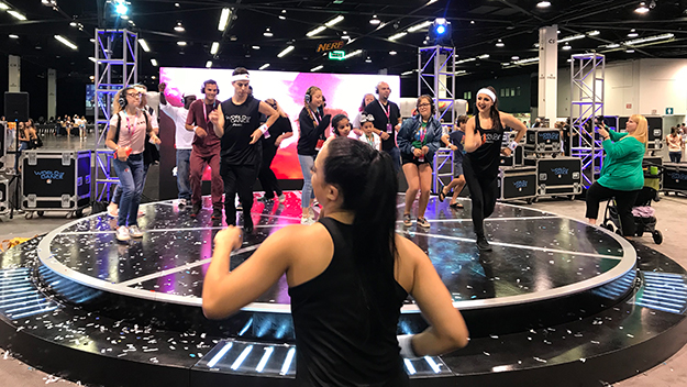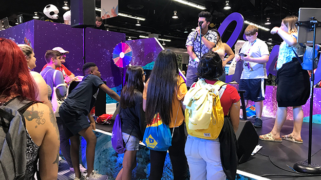 NAB Showと近いところではメインフロアには業界関係各社がこぞってブースを出展していること、そして別館にて随時セミナーやワークショップが開かれている形式だ。ただし来場者の多くがティーンということもあって、どのブースも目を引くアトラクションを用意している。トランポリンに巨大ベッドにダンスフロアと、どのブースも「今すぐシェアしたい」と思わせようと必死だ。