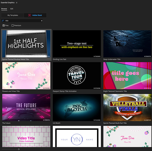 エッセンシャルグラフィックの機能では、ゼロからテロップなどをデザインする事も可能だが、Adobe Stockと呼ばれる素材ストックサービスにもアクセスが可能だ。タイトルのテンプレートを大量に試すことができる上、無料配布のものも多い。つまり時間がない時でも、モーショングラフィックを高いレベルにまで引き上げられるのだ。