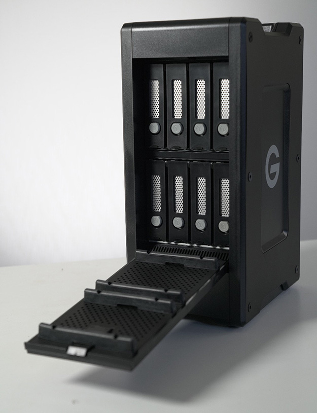 ここ数年、編集用メインストレージとしてG-Technology社のG-SPEED Shuttle XL(Thunderbolt2接続)の64TBモデルをRAID5で使用している。速度的には平均850MB/sと高速だ。筆者が仕事で多く扱うのがFS7の4k60pのX-AVC Iファイルだが、ネイティブで扱っても問題無く編集が行える。