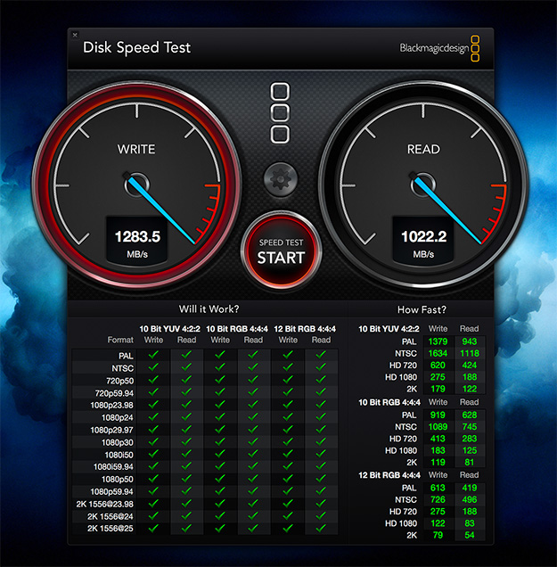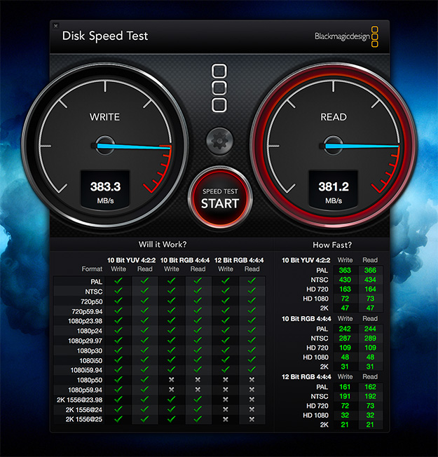 残念ながら試作機のため、収録やデータの持ち帰りはできないので実際収録ができるかどうかのテストはできなかったのだが、Speed Testで読み書き平均500MB/sは出るモデルなのでおそらく問題は無いと思う。