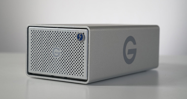 続いて進行中の編集データのバックアップストレージを紹介しよう。同じくG-technologyのG-RAID with Thunderbolt 3だ。これは2台のHDDをRAID0(一つのHDDと認識し、高速化)で運用している。現在進行中の編集が佳境に入ったところで万が一編集ストレージが壊れてしまった場合を想定し1日に1度、まるっとコピーをする事にしている。速度的にも約400MB/sなので緊急時にそのまま編集を進行するのも可能だ。このモデルは容量によって最大速度が異なる。速度を求める場合は容量の大きいものを選ぶといいだろう。
