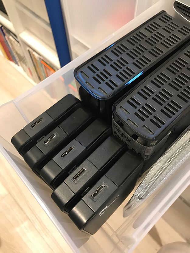 撮影した元素材に関しては、編集ストレージに入れて進行中のプロジェクトのものだけに限ってポータブルHDDやポータブルSSDにコピーして保管していく。こちらは基本「バックアップのバックアップ」なので、SSDに比較すると転送は遅くはなるが、ごく普通のHDDでも問題は無い。ただ時は金なり。余裕があるならば高速の外付けSSDの選択もアリだろう。