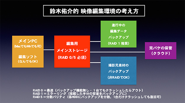 編集ストレージを決める前に、まずは己の編集環境を俯瞰で考えてデザインする事をオススメする。編集作業に必要な構成を、要するに、編集マシン・編集用のメインストレージ・進行中データのバックアップ/元素材のバックアップ・完パケの保管をどうやって行うか。これを視覚化するとデータ管理もしやすくなるはずだ。筆者の編集環境の考え方の大枠と最近の編集環境を紹介しよう。