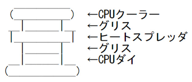 i9の10コアは、設計的に高温となりグリスバーガー状態になってしまう恐れがあります。グリスバーガーとは、CPUの世代がSandy BridgeからIvy Bridgeへ変わる際に話題になったPCスラングで、CPUダイとヒートスプレッダとの間にハンダを採用せずにグリスを採用したことによって、CPUクーラー、ヒートスプレッダ、CPUダイに挟まれたグリスが高温になることが予想され、マーケットにネガティブな反応が起こりました。このグリス方式を揶揄する形でハンバーガーに例えたアスキーアートが有名になり「グリスバーガー状態」がイディオムになりました。