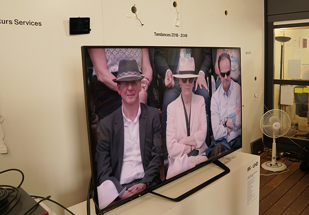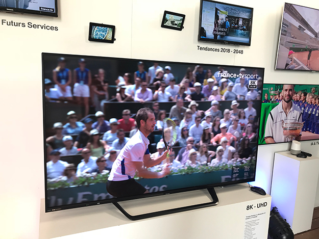 同時に会場では、フランステレビジョンが行っている4K試験放送の映像も展示されており、4K放送の映像と8K映像の比較も可能だった。4K放送は一部HDカメラからのアップコンバートであることや、HEVCによる圧縮率が高く不利な状況ではあることを差し引いても、精細感の差は明らか。動く被写体であるスポーツ系の映像では、高解像度映像の差は少ないと言う向きもあるが、65から70型の大型画面でテニス会場の観客の顔まで見える精細さや、ネット越しの選手の表情まで見える臨場感は8K映像の可能性を垣間見る事ができるものだった。