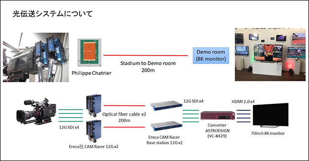 戒能氏:先ほどご紹介したセンターコート上の固定カメラの設置場所と、このデモ会場の間に光ファイバを2本敷設し、12G-SDI 2系統の伝送を実現する、Eraca社のCam Racerを2セット組み合わせ、4系統の12G-SDIを転送できる環境を用意しました。