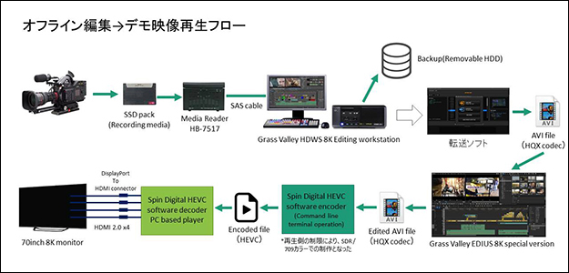 編集後の出力も一旦HQXコーデックのファイルとして行い、それをSpin DigitalのHEVCソフトウエアエンコーダーを使って、200Mbpsのストリームに圧縮。このファイルをデモ会場にある8Kテレビに接続された再生用PCにコピーし、こちらもSpin Digitalの再生ソフトを使って再生しています。