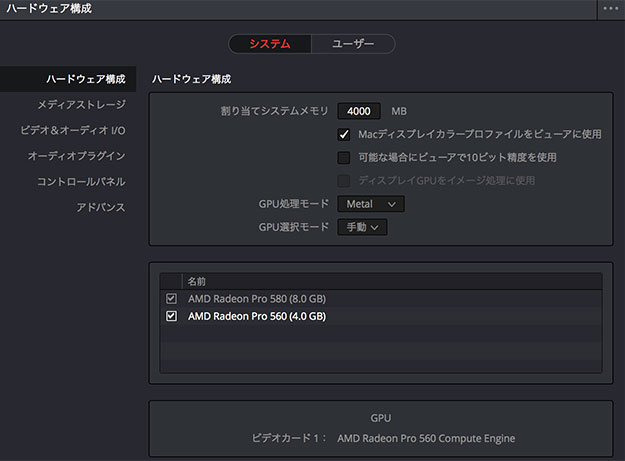 GPUの切り替えはDaVinci Resolveの「環境設定」の中の「ハードウェア構成」で設定を行う。GPU処理モードを「Metal」にGPUの選択モードを「手動」にし表示されているGPU名の左にあるチェックボックスで選択して「保存」する任意のGPUを選択後、DaVinciを再起動して適用される。
