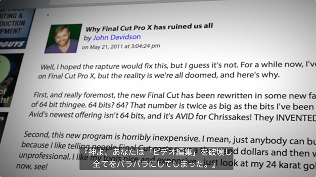どのような背景があったにせよ、FCPXへの変化はこれまでのFCP7ユーザーに大きな「痛み」をもたらした。先のパートナーのビジネスへの影響もそうだが、さまざまなユーザーに影響を与えていた。本作では前半の部分でこのことについて触れられている。