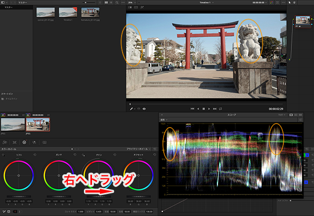 次に明部の調整。ゲインのマスターホイールを右に回してグラフを上に伸ばし、画面内の主要な被写体である狛犬のハイライト部分の「明るさ」を決める(図03-04)