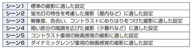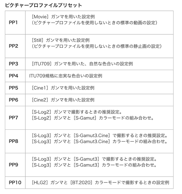 ソニーやパナソニックのカメラには、カラー調整をしないまま納品する「撮って出し」の設定と、撮影後のカラーグレーディングを前提とする設定が実装されている。ピクチャープロファイルやシーンファイルと呼ばれるもので、その中には「Cine2」や「CINE-LIKE D」(パンソニックのシーン6)といった「コントラストを低め」に設定したプリセットが収納されている。