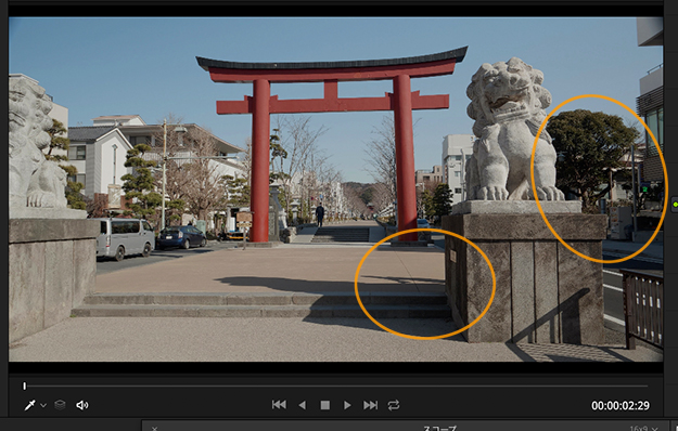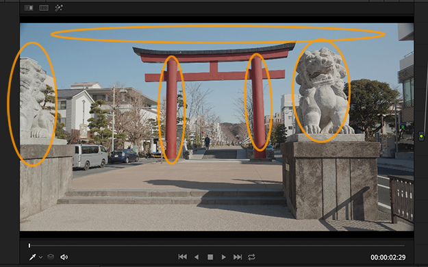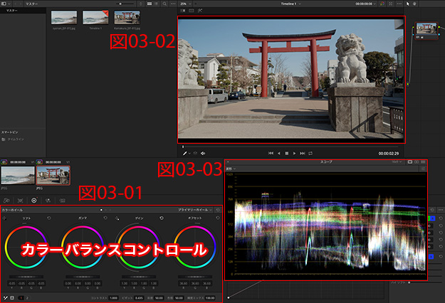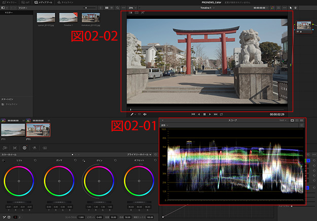 波形モニター(図02-01)の横軸は画面内のモノの位置に対応しており、この図では白い狛犬や赤い鳥居、青い空(図02-02)が波形モニター上で確認できる(オレンジ色の囲み部分)。また縦軸は輝度を表しており、10bit処理をしているDaVinci Resolveは真っ黒が「0」、真っ白は「1023」となる(8bit処理なら0~255)。