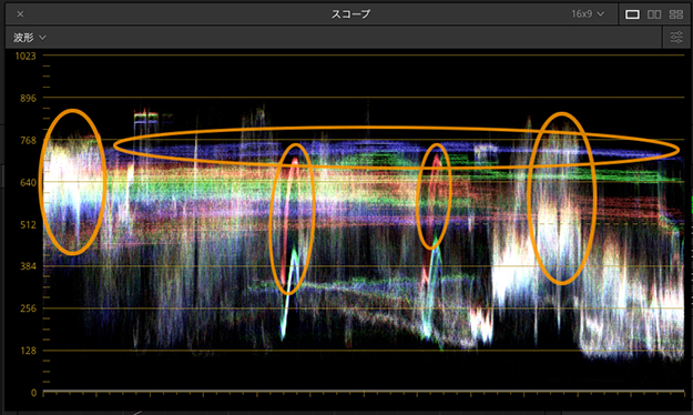 実際のコントラスト調整に入る前に、映像の明るさ(輝度)を表すグラフ「波形モニター」(ウェーブフォームともいう)を見てみよう。図02をご覧いただきたい。