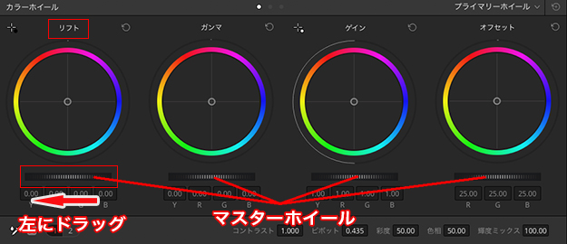 プライマリーホイールのカラーバランスコントロールである「リフト」「ガンマ」「ゲイン」の調整範囲は、大まかに映像の暗部・中間部・明部に相当している。ちなみにイメージ全体の調整は「オフセット」で行う。コントラスト調整は、カラーバランスコントロールの下にある「マスターホイール」をマウスで左右にドラッグすること(回すこと)で調整する。