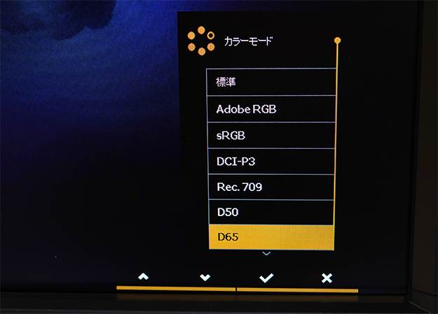 デフォルトでAdobe RGB、sRGB、Rec.709、Rec.2020、DCI-3Pなど、必要な色域をワンタッチでブラックアウトなしで選択できるのも嬉しい