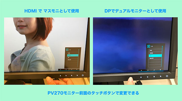 PV270とPC本体を別のケーブルで繋いでいれば、用途に応じてデュアルディスプレイ環境にもできる