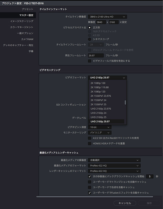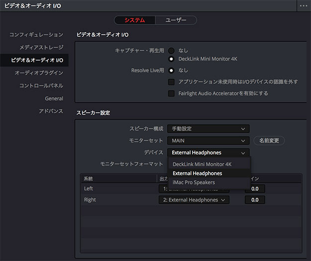 設定はUltra Studioと同様、あとはBlackmagic Video Assistをインストールの上、DaVinci Resolveでの環境設定でビデオI/O設定をすれば良い(キャプチャー・再生用のI/0はDeckLink Mini Monitorを選択する)。あとはプロジェクト設定(右下の歯車マーク)からモニタリングの解像度とフレームレートを選択する。