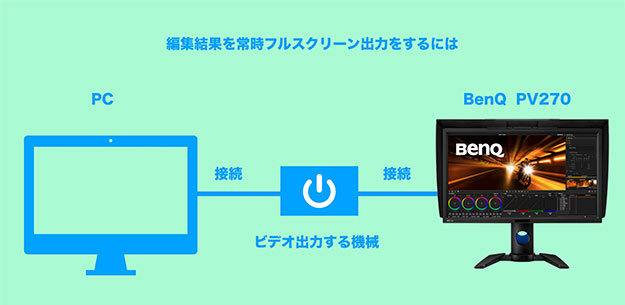 DaVinci Resolveで「常時フルスクリーン出力」をする場合はUltraStudio(Thunderbolt 2/3接続)やDeckLink(PCI接続)などのビデオ出力機器が必要となる。要するにPV270(リファレンスモニター)とPCの間に「ビデオ出力する機械」を挟む必要がある訳だ。