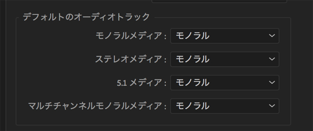 環境設定のタイムラインで「デフォルトのオーディオトラック」の「ステレオメディア」を「モノラル」にしておく。ステレオファイルになっていても2モノラルにしてくれるこの機能は、「素材を読み込む前の設定」になることに注意してください。