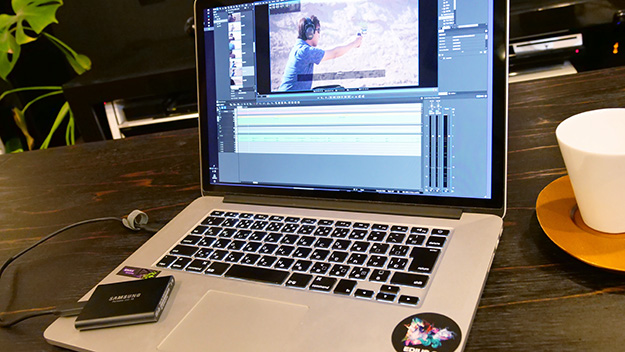そして、Samsung Portable SSD T5は外付けストレージの運用姿勢に転換をもたらしてくれるとも思える出会いだった。容量が必要となる映像制作では2.5インチHDDによる外部ストレージがコストパフォーマンスにも優れ現実的だが、2.5インチHDDとはいえ場所を取るし、扱いにも慎重さが求められる。一方、Portable SSD T5はその小型軽量さ加減が気軽な扱いを可能にし、運用の頻度も上げてくれた。このサイズからは想像できないような大容量と高速転送の実現は、ノートPCでのポータブル編集の場面を増やしてくれそうだ。