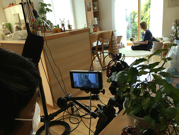 撮影の山場は赤ちゃんの出番。できればいい笑顔を狙いたい。赤子は朝早いうちが勝負なので、とにかく準備が整って一番に赤ちゃん出演シーンから撮り始めた。母役の女優さんは、当日さすが毎日赤子をあやしているだけあって、扱いは心得ている。だけれど、たったいま機嫌のよかった赤ちゃんも暑い照明の下にさらされると途端に機嫌が悪くなる。数分しかもたないのだ。その短いチャンスを狙って、スタッフ総出で笑顔をひきだす。鏡が大好きと実際のお母さんから聞き出し、ヘアメイクさんが赤子の目線を作ることに成功するものの、なかなか笑顔はやってこない。
