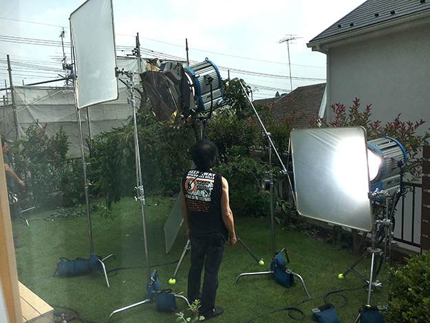 演出コンテを描いて二週間後はもう撮影日だった。真夏の雲一つない猛暑日。しかし窓辺にやさしげな木漏れ日を落とすために、庭にはHMIライトが三灯も置かれていた。撮影は私がドラマを撮る時にはいつもお願いしている大ベテランの松島孝助さん。カメラはLUMIX GH5で、収録はV-Log撮影。移動車やセッティングにかかる時間を節約するために、今回は手持ち用のスタビライザーとしてDJIのRonin-Sを使った。