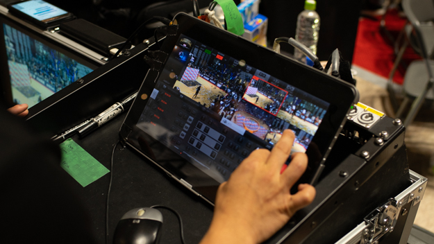 遠藤氏は、Streamstar X7を使って大型LEDディスプレイに対して送り出す映像を担当。会場内の大型LEDディスプレイでショーアップするための画出しのベース基地みたいな形としてもStreamstarが活用されていた。遠藤氏のStreamstar X7からはカメラの入力の画や中に用意した場内のショーアップ用の画、3×3公式スコアのコンピューターから出てきたスコアを出すこともできる。パンダスタジオはX4とX7の2台のStreamstarを効率よく使い分けていた。このほか、ゴール下のカメラに付いている周氏の3名によって配信が行われていた。