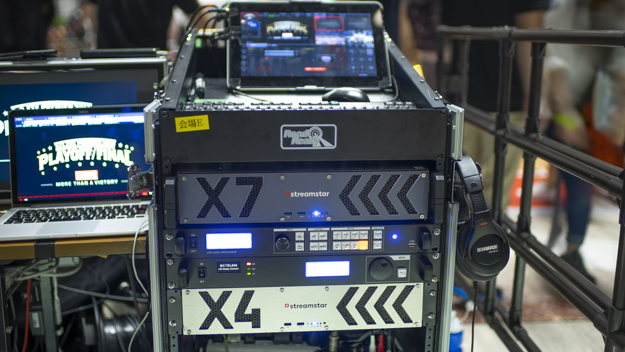 中継スペースの機材ラックを見ると、上からStreamstar X7、大型LEDディスプレイのスケーラー、大型LEDディスプレイのコントローラー、Streamstar X4、UPSが1台にまとめられていた。パンダスタジオの山田氏は、Streamstar X4の4入力に4台のカメラ入力を入れてスイッチングやリプレイ映像を担当。