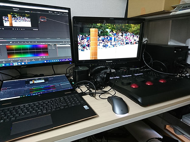 しかし、ノートPCではビデオモニタプレビューが出来ず、正確な色味が取れない、という欠点がある。ノートPCでのビデオモニタの業界標準機「AJA iO4K」も、BMD社とライバル会社関係ということもあり、DaVinch Resolveでは利用できない。BMDのビデオアウト機器類も、PC拡張ボードのDeck Linkシリーズやラックマウントタイプのものばかりで、ノートPCに対応した手軽なビデオ信号出力方法は存在しないのが実情だ。また、当然にストレージボードもさせないため、再生方法にも問題がある。
