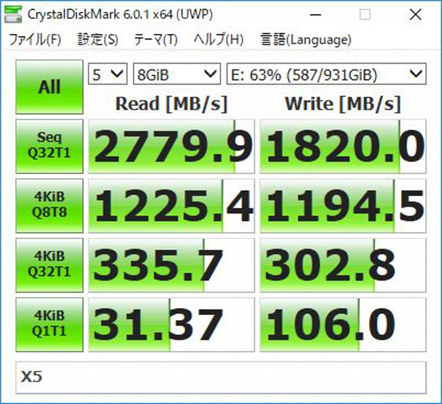 CrystalDiskによる内蔵SSDストレージのスピードチェック- リアルタイム性能