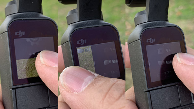 コンパクトになると、どうしても撮った映像は別途スマートフォンなどで確認する必要があったが、Osmo Pocketではタッチスクリーンが搭載されており、スマートフォンいらずでメニュー変更や再生チェックが行えるのがとても嬉しい。変更方法は大きく2種類。