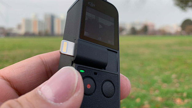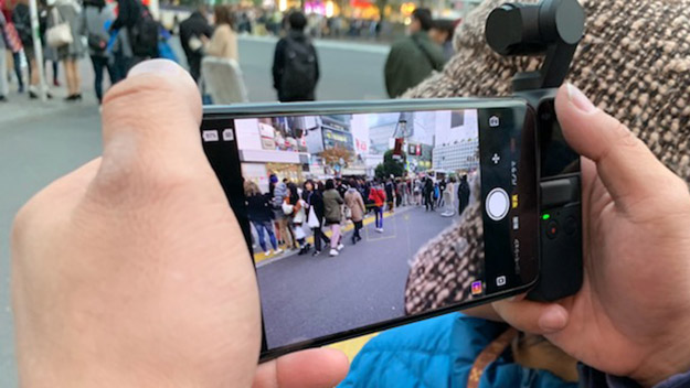 カメラ単体でも大満足なのだが、付属品としてAndroidやiPhoneに接続するためのアダプター(Lightning/USB-Cアダプター)が同梱されている。このアダプターにより、Osmo Pocketとスマートフォンを接続することで、専用アプリのDJI Mimoが自動的に立ち上がり 、スマートフォンが大画面モニターに早変わりする。筆者はiPhone XS Maxなので有機ELモニターが瞬時に誕生した。