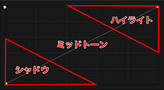 カスタムカーブの初期状態(デフォルト)は右上から左下への直線。図02_01は、グラフのどの部分が映像のどこの明るさ(ハイライト・ミッドトーン・シャドウ)に対応しているかをおおまかに表したものだ。