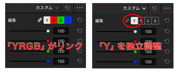 図03_01は「YRGB」がリンクされた状態でカーブ操作をしている。