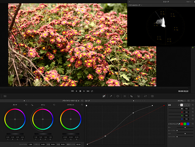 カスタムカーブを見ると、ともにコントラストを上げる調整である「S字」カーブ(ハイライトを上にドラッグし、シャドウは下げる)を描いている。ふたつの画像を見比べれば、ベクトルスコープを検証するまでもなく彩度の違いは一目瞭然だろう。