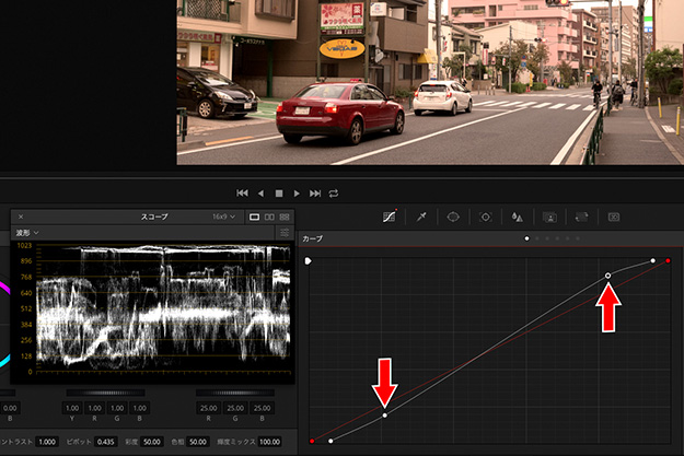 カーブの基本操作は、グラフの線上をクリックしてコントロールポイントを追加し、そのポイントを上下にドラッグして曲線を描く。コントロールポイントを上にドラッグすれば明るくなり、波形モニターやパレードスコープの波形も上に伸びる。反対にコントロールポイントを下げてカーブを下に曲げれば暗くなる。