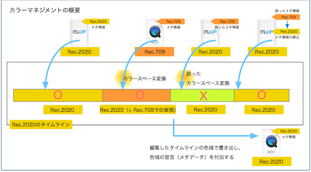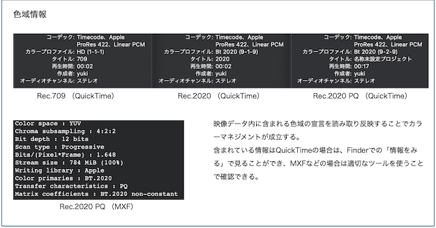 2つ目は編集される素材の色域の管理だ。素材となるデータの色域の宣言はメタデータに含まれている。QuickTimeであればnclcであったり、MXFにも格納されるパラメータが用意されている。これを読み取り反映させることが求められる。